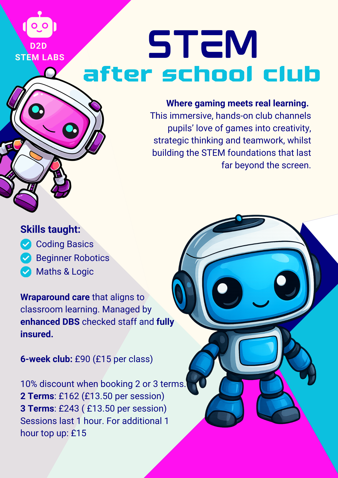 Want to offer your pupils an engaging enrichment with measurable learning outcomes? Our wrap-around care is provided by DBS checked staff, offering a one-hour class after school. For parents wanting additional time, a one-hour top up is available.
